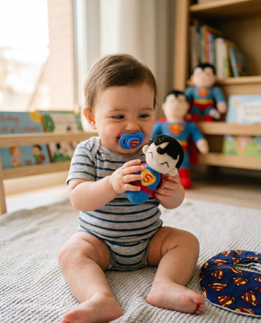 • Babero temático: Porque incluso los héroes tienen accidentes con la papilla de "kryptonita" verde. 🍼