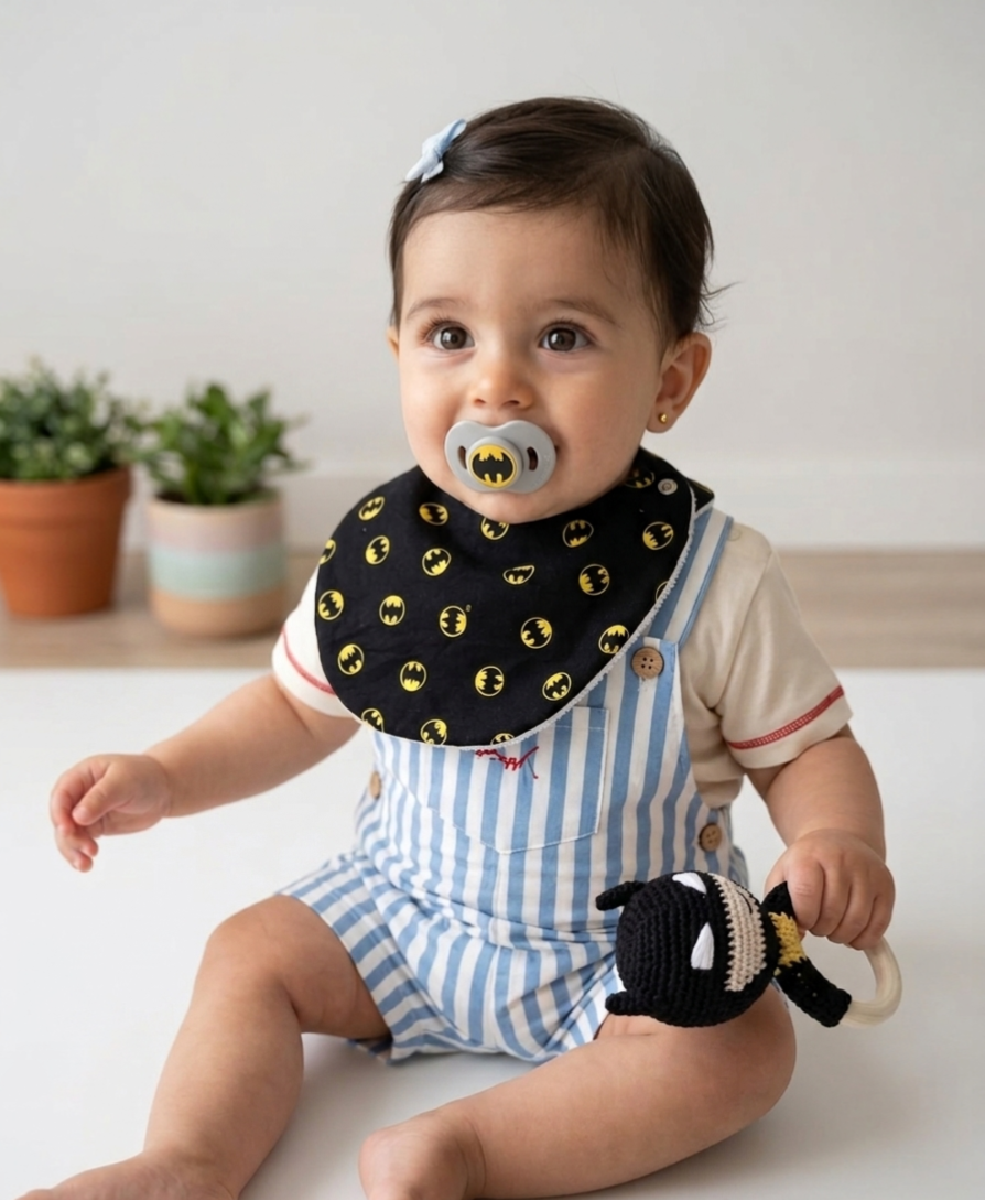 No todos los héroes llevan capa, ¡algunos llevan pañales! Con este kit exclusivo de Batman, tu pequeño estará preparado para proteger Gotham City (o al menos su carrito) de cualquier villano. Cada pieza de este pack ha sido diseñada para combinar la estética del murciélago más famoso con la suavidad que solo el trabajo artesanal puede ofrecer. ¡Es hora de encender la Bat-señal!