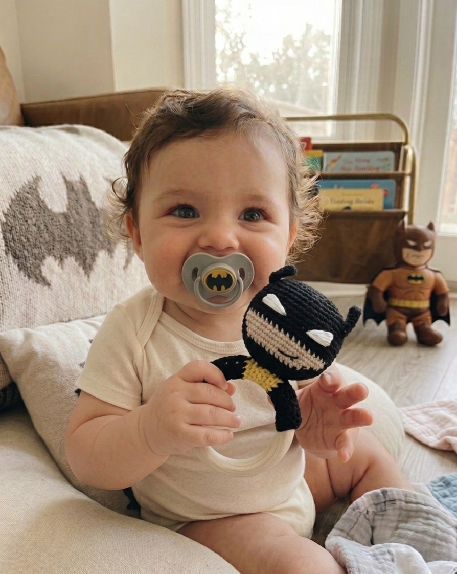 • Chupete Temático: El accesorio final para que tu bebé luzca imbatible en sus paseos nocturnos (o siestas diurnas).